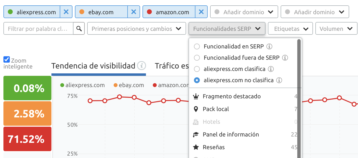 Ajusta tu dominio el primero en el menú superior, elige en el menú desplegable de Funcionalidades SERP → "tu dominio posiciona" → selecciona la funcionalidad objetivo.