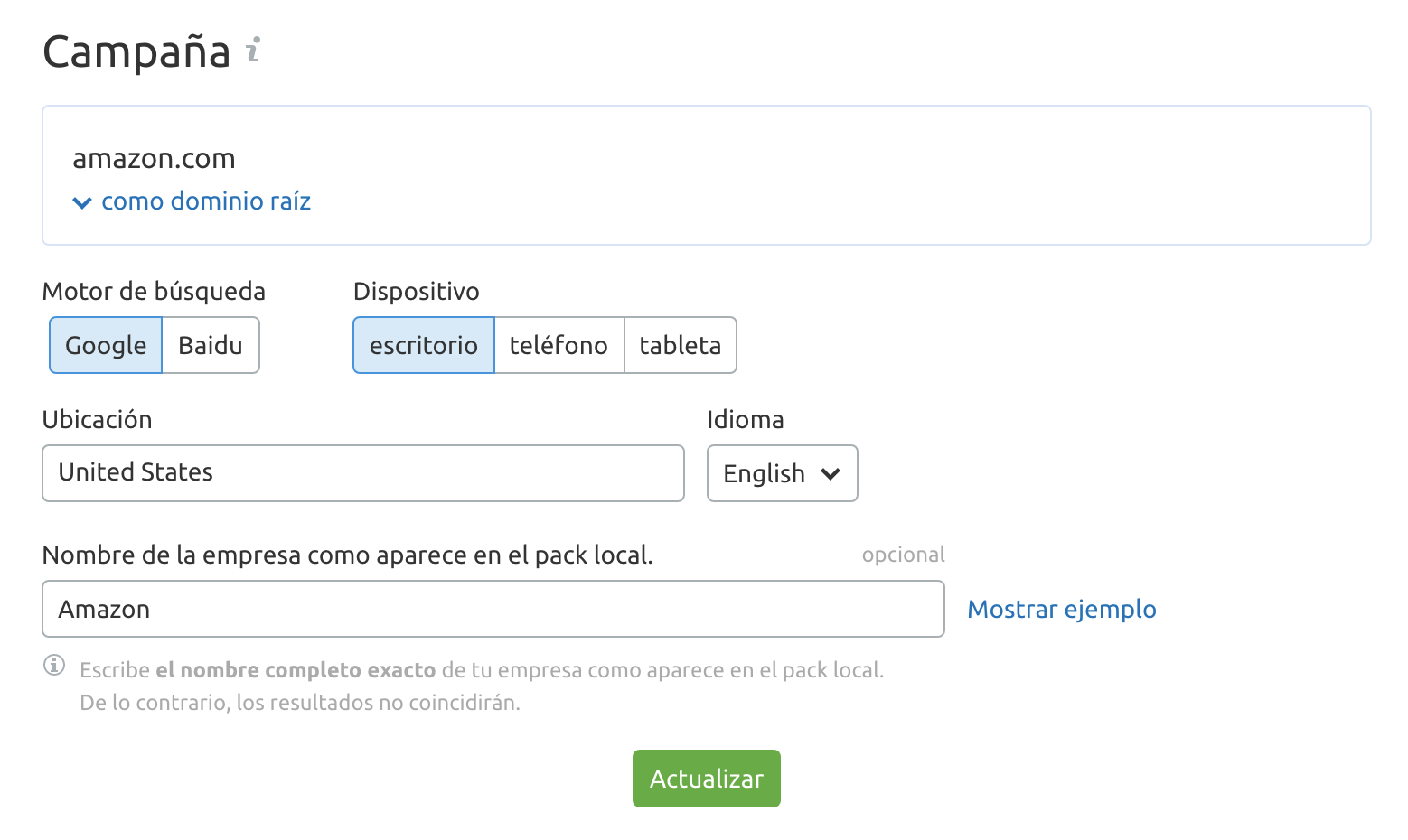 Por lo tanto, para seguir los resultados más precisos, necesitas asegurarte de que especificas tanto la localización como el idioma de tus palabras clave objetivo en el paso de configuración.