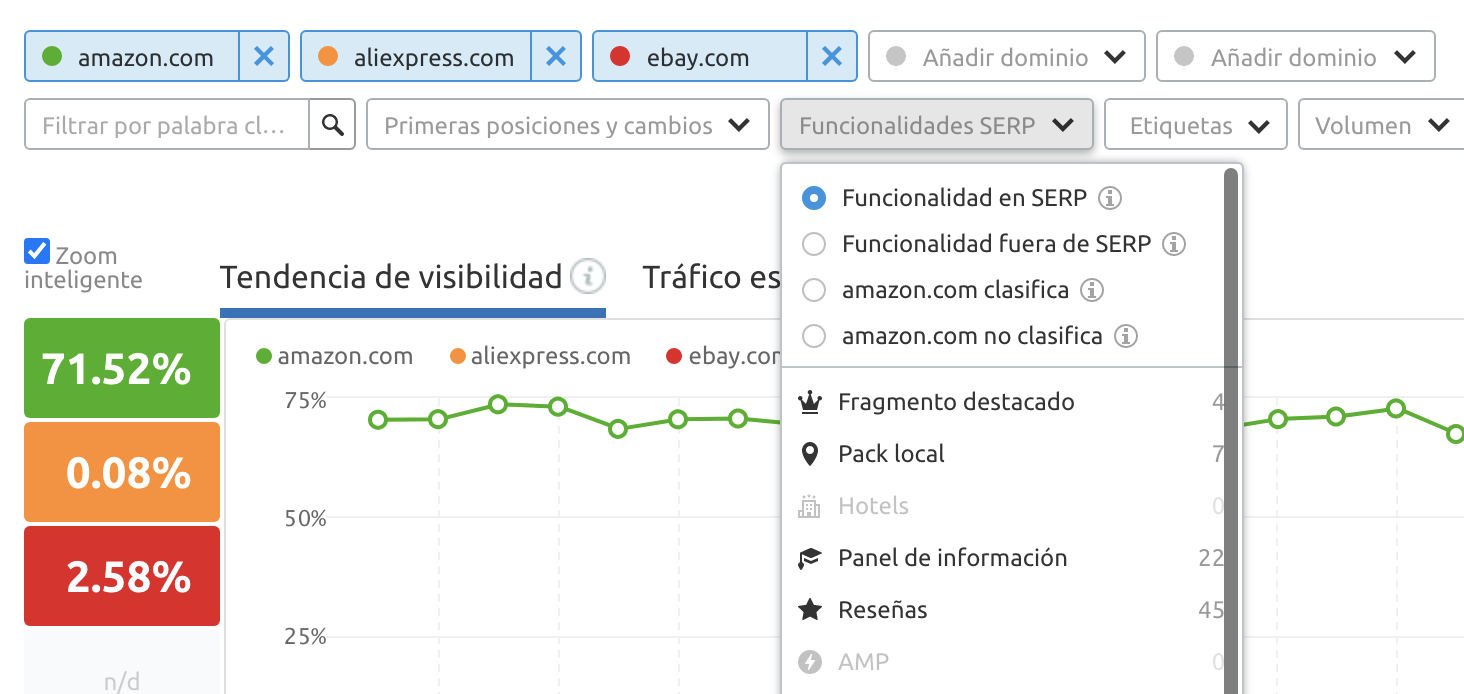 Elige en el menú desplegable de Funcionalidades SERP → "Destacado en SERP" → selecciona la funcionalidad objetivo.