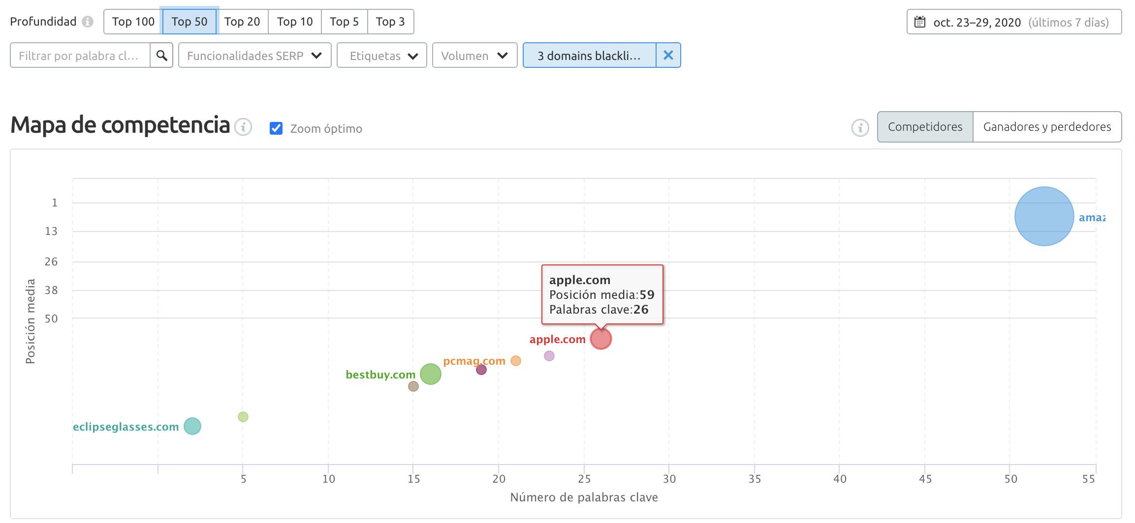 Echa un vistazo a nuestro informe de descubrimiento de competidores para ver exactamente quién está compitiendo por tus palabras clave objetivo en la localización y el dispositivo que buscas.