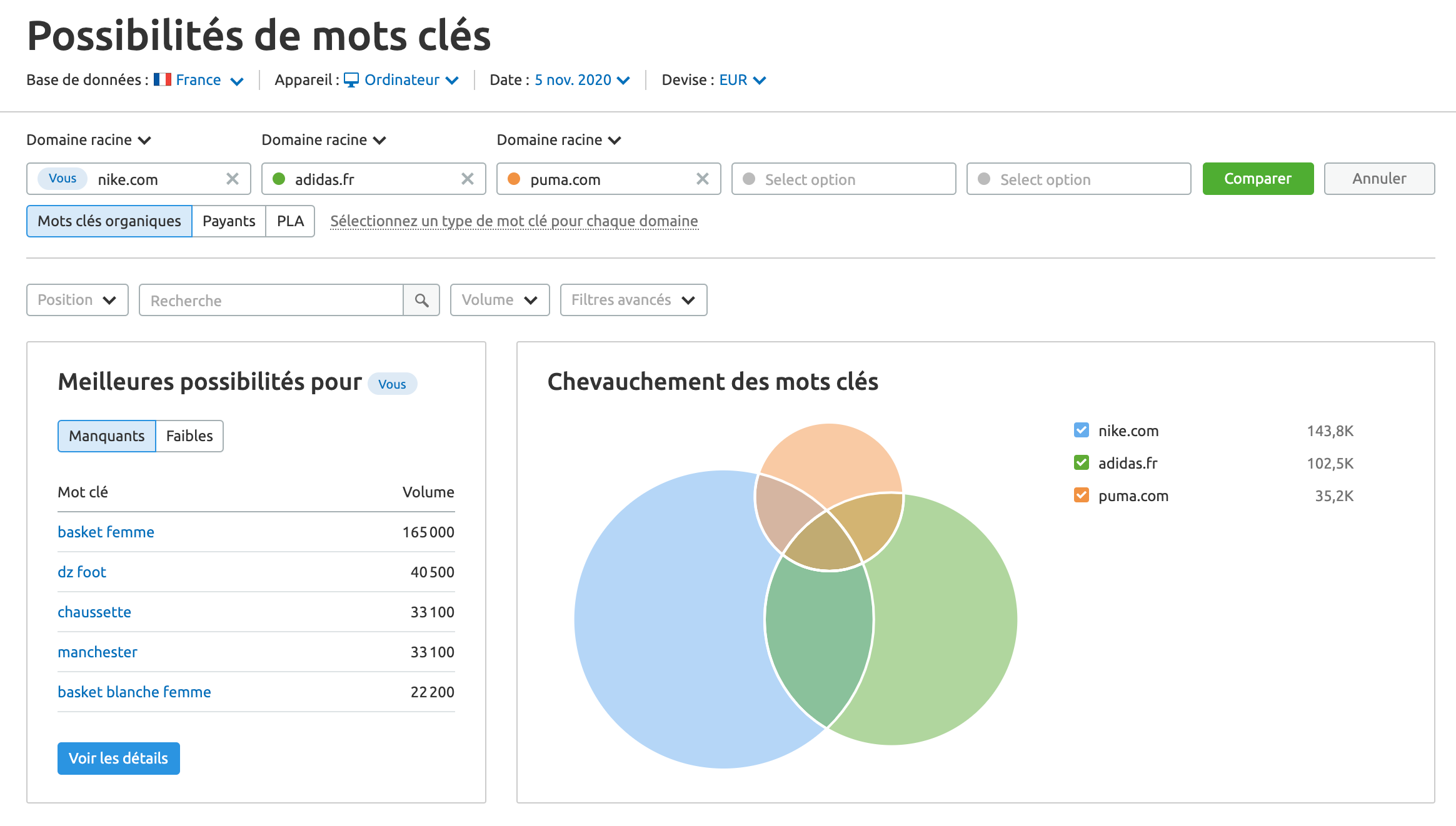 - Identifier les cibles des mots clés : Une analyse efficace des Possibilités de mots clés doit vous permettre d'identifier les fruits que vous n'aurez qu'à cueillir et qui seront des gains rapides pour votre client. À partir de là, vous voudrez également découvrir les mots clés pour lesquels vos concurrents se classent et les aspects sur lesquels vous êtes entièrement mauvais. Notre outil vous permet de comparer et de visualiser les données des mots clés pour un maximum de cinq URL concurrentes.
