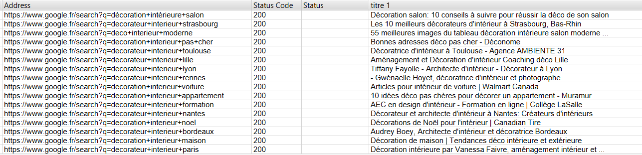 Utilisez le générateur d’URL Google afin d’extraire le maximum de URL SERP. Voici un exemple pour vous aider => Feuille de calcul.