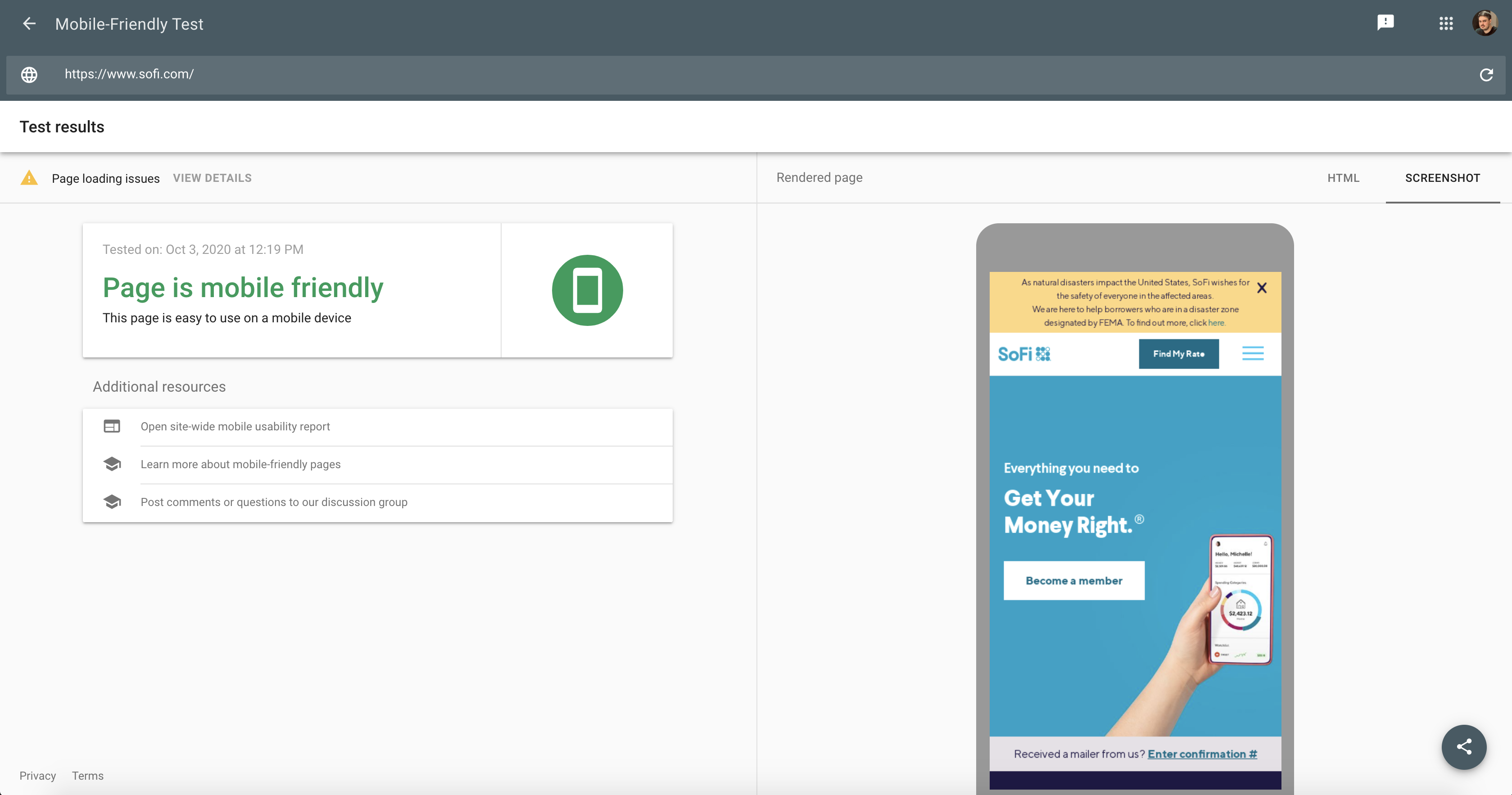 Dans ce cas, la page passe le test d'optimisation mobile "mobile friendly" mais signale un certain nombre de problèmes de chargement qui pourraient nécessiter un examen plus approfondi.
