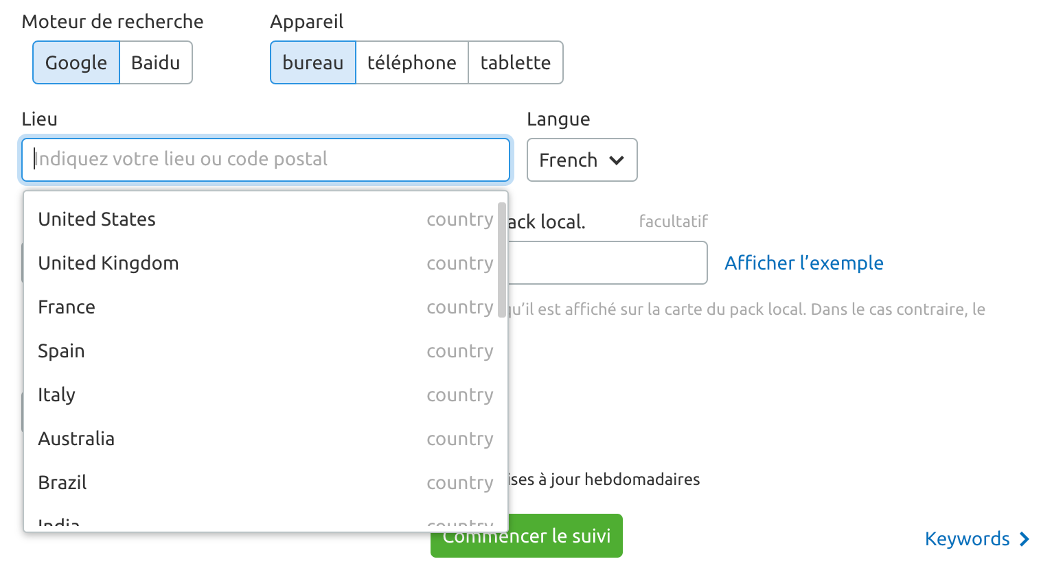 Avec un forfait Guru, vous pouvez suivre vos mots clés cibles sur un maximum de 10 ciblages par projet : par ciblage, nous entendons combinaison de lieu, d'appareil et de langue.