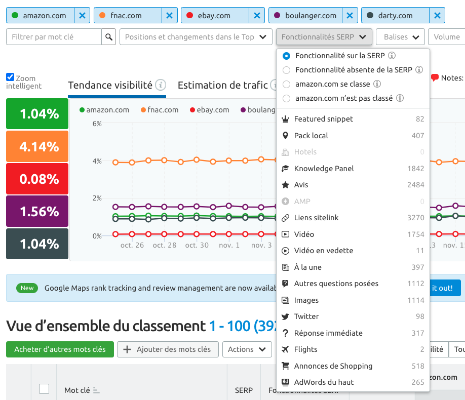 Choisissez dans le menu déroulant Fonctionnalités SERP → « Fonctionnalité sur la SERP » → sélectionnez la fonctionnalité cible.
