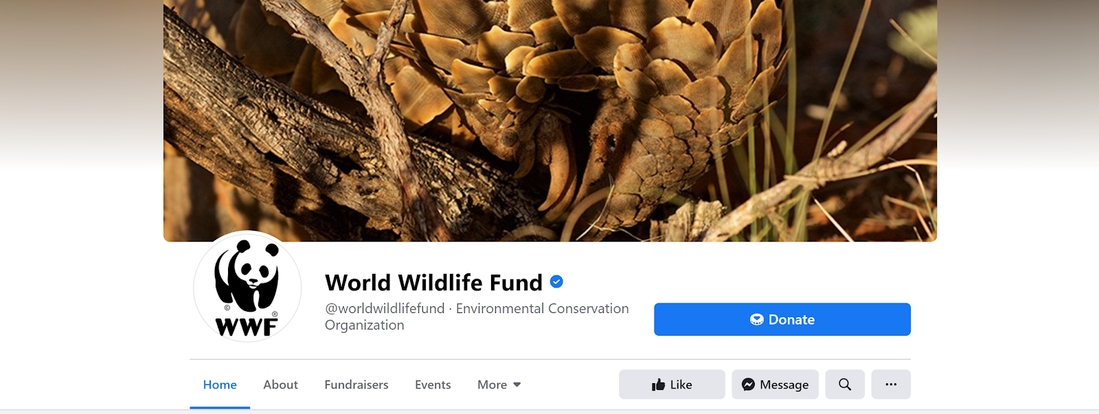 Il World Wildlife Fund (WWF) è un ottimo esempio di organizzazione non-profit con una forte presenza sui social media. Hanno account su quattro piattaforme social - nello specifico Facebook, Twitter, Instagram e YouTube - ciascuno ottimizzato per le donazioni. Ad esempio, nella parte superiore della pagina Facebook del WWF c'è il pulsante "Dona".